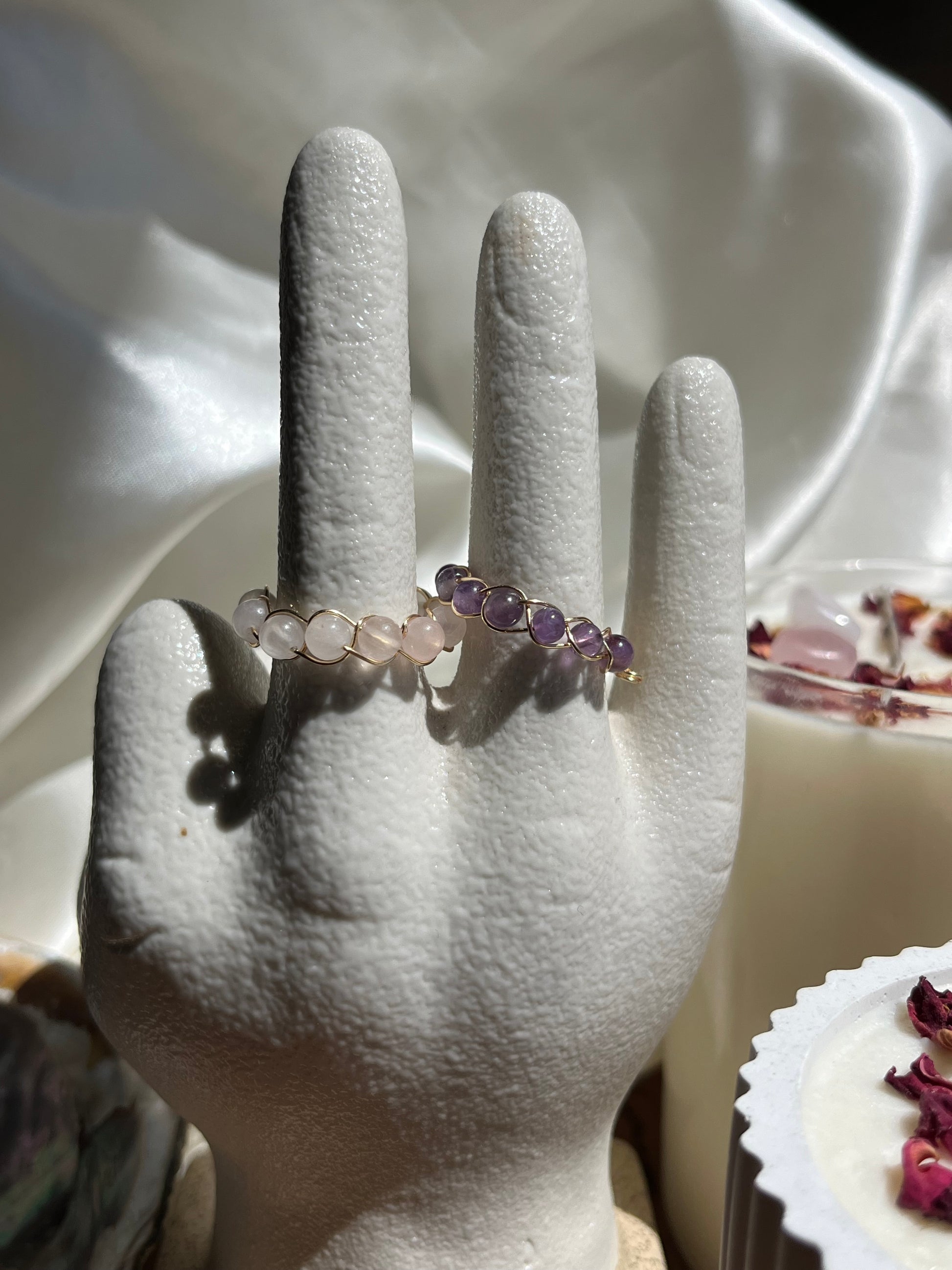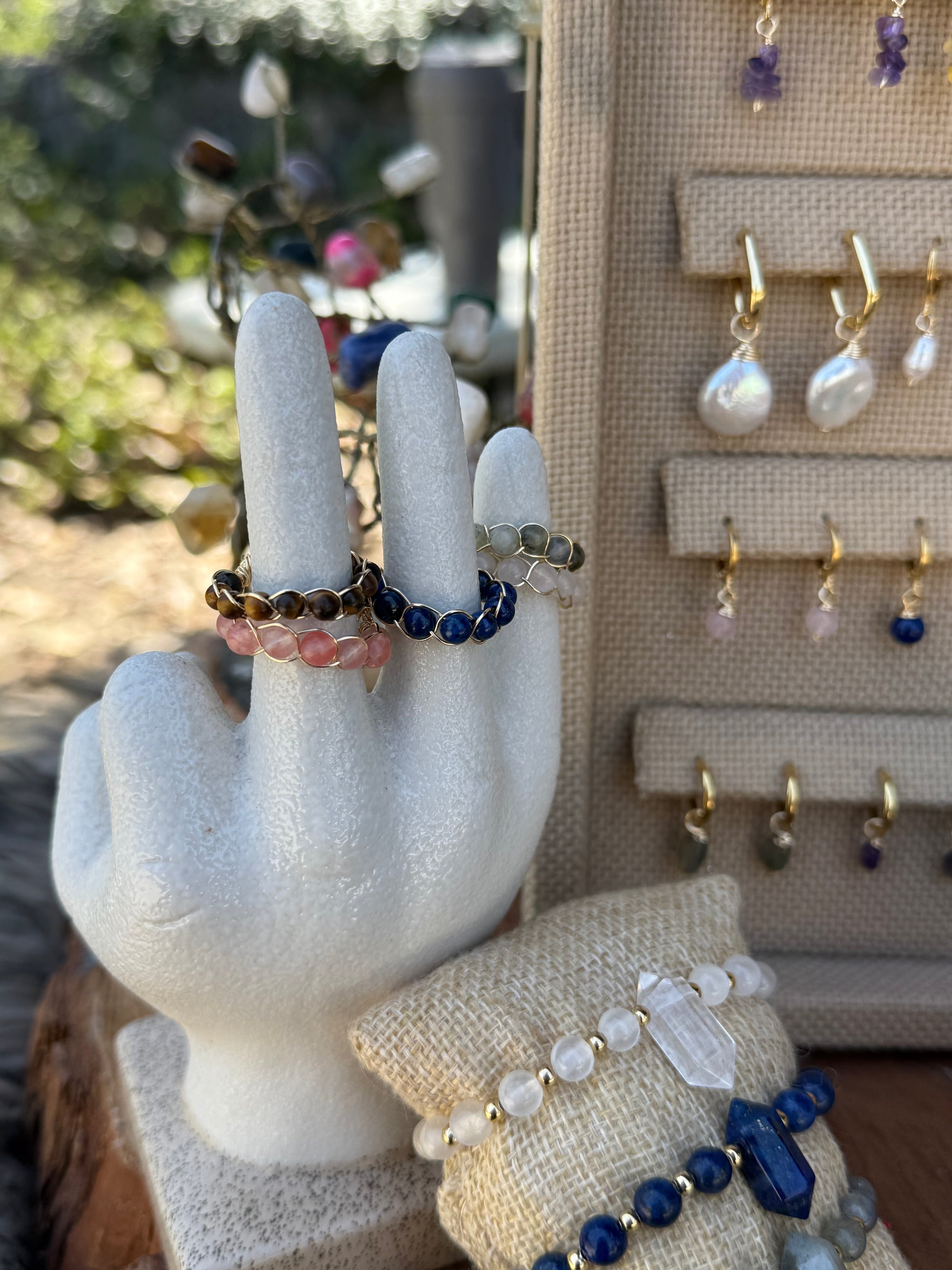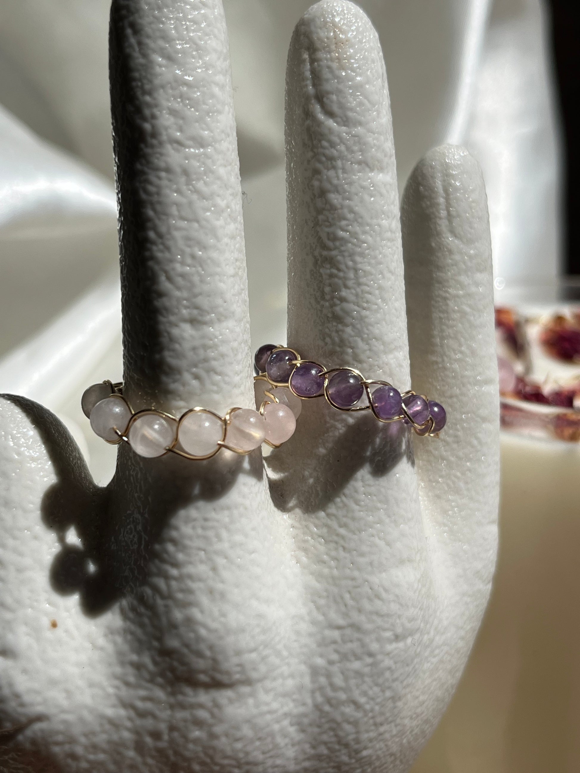 Anillo hecho a mano, trenzado con diferentes cuarzos, bola 4mm. A la medida desde talla 6.5 a 11. Todas las piedras, formas son diferentes.