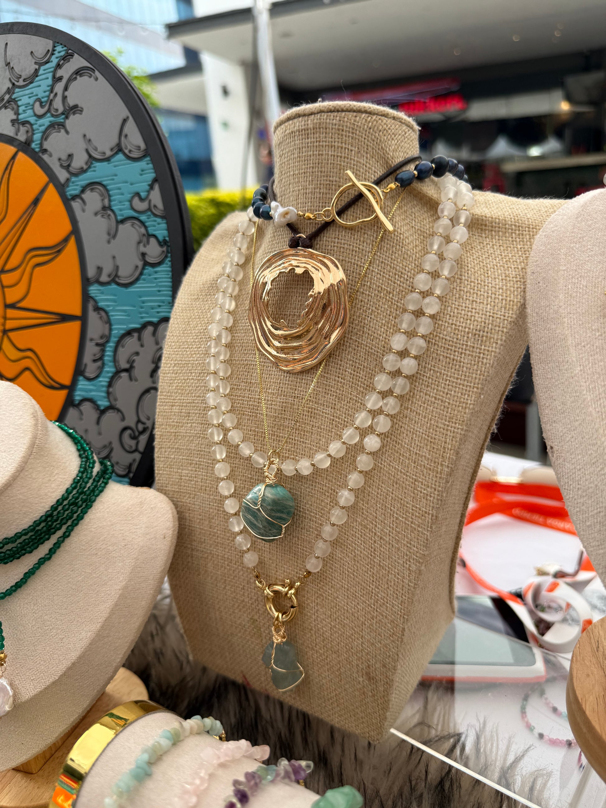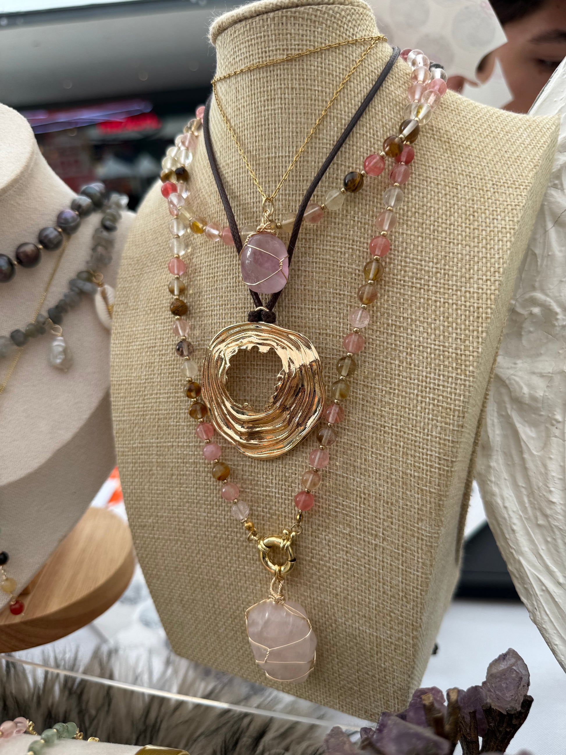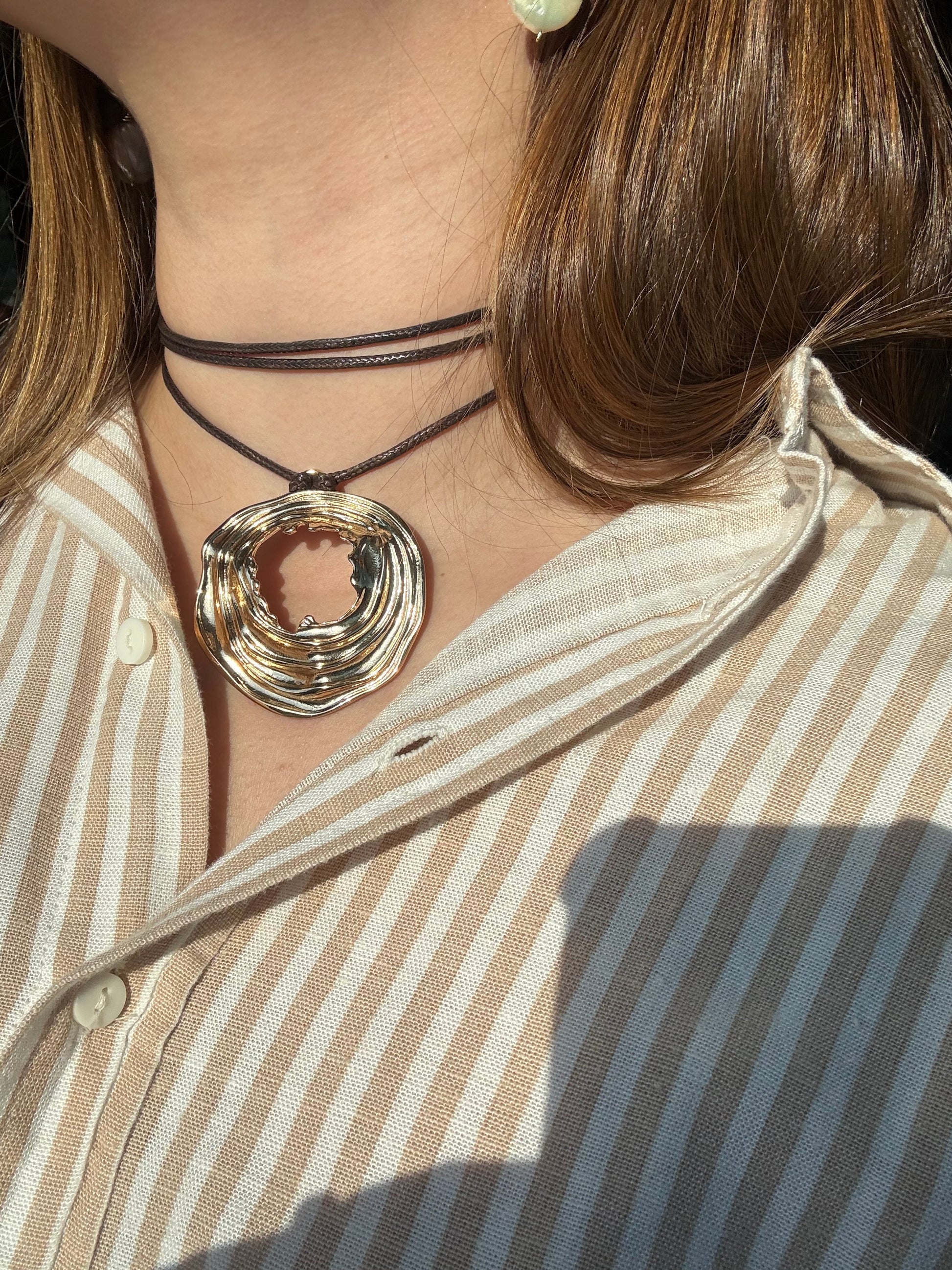 Collar con dije de chapa de oro, mide aproximadamente 1 metro 50 cm, cordón tono café oscuro.