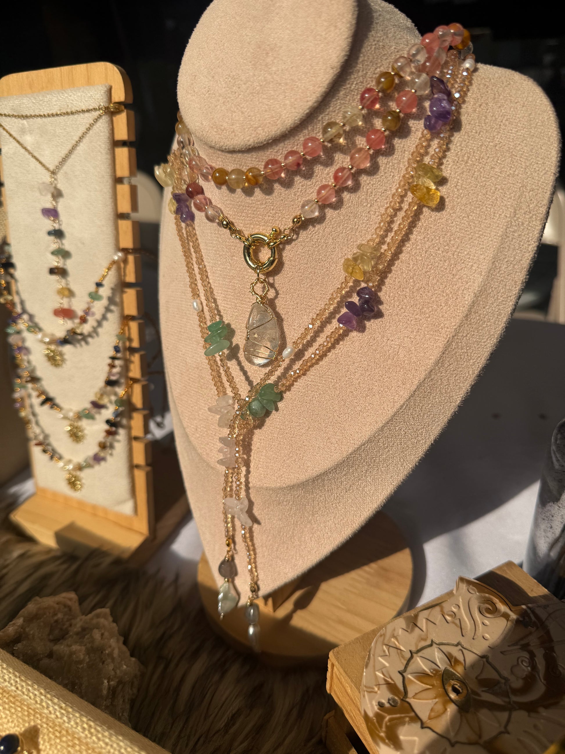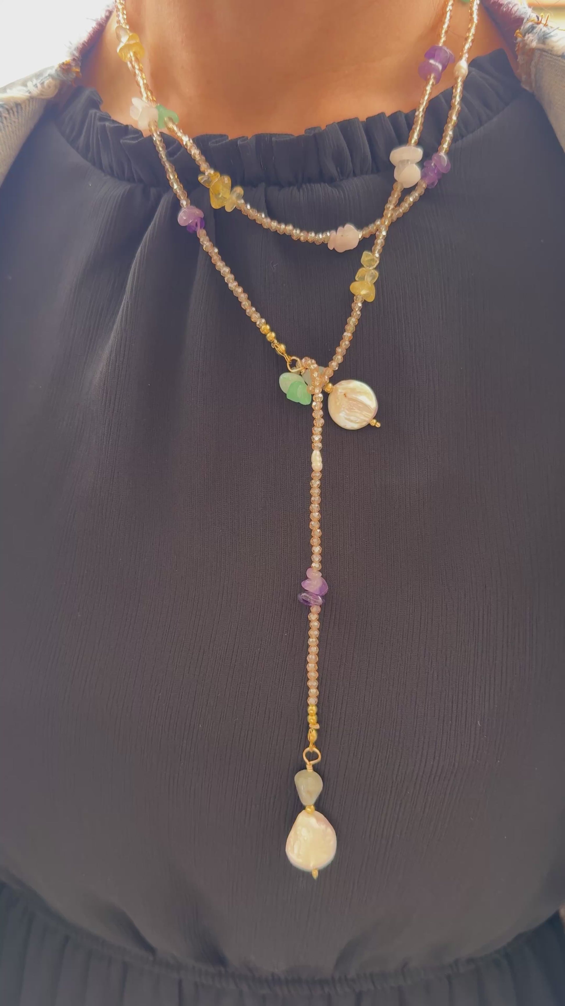 Collar de piedra rondel con cuarzo rosa, amatista, citrino y aventurina verde con labradorita, perlas de río y perla barroca al final.