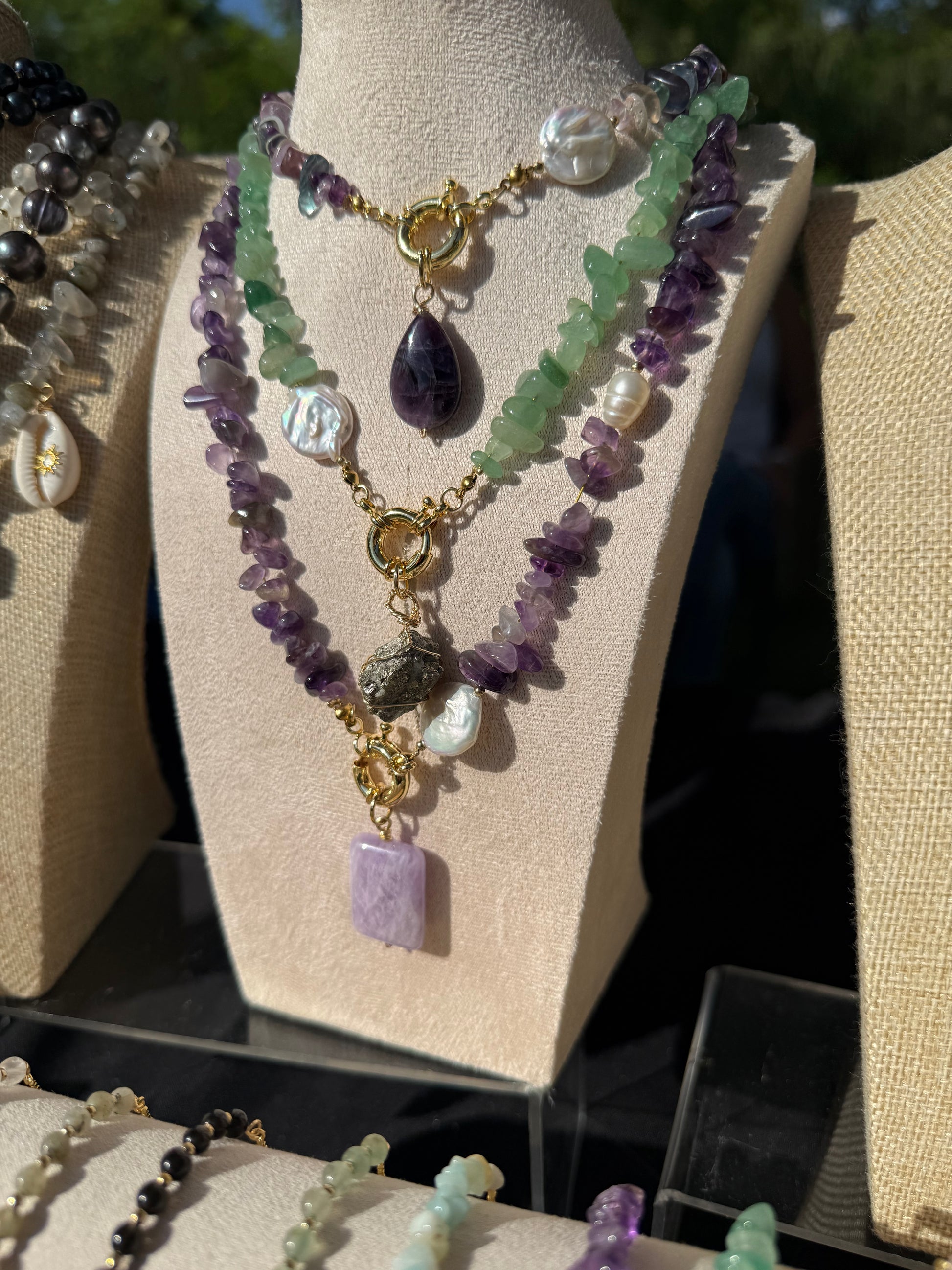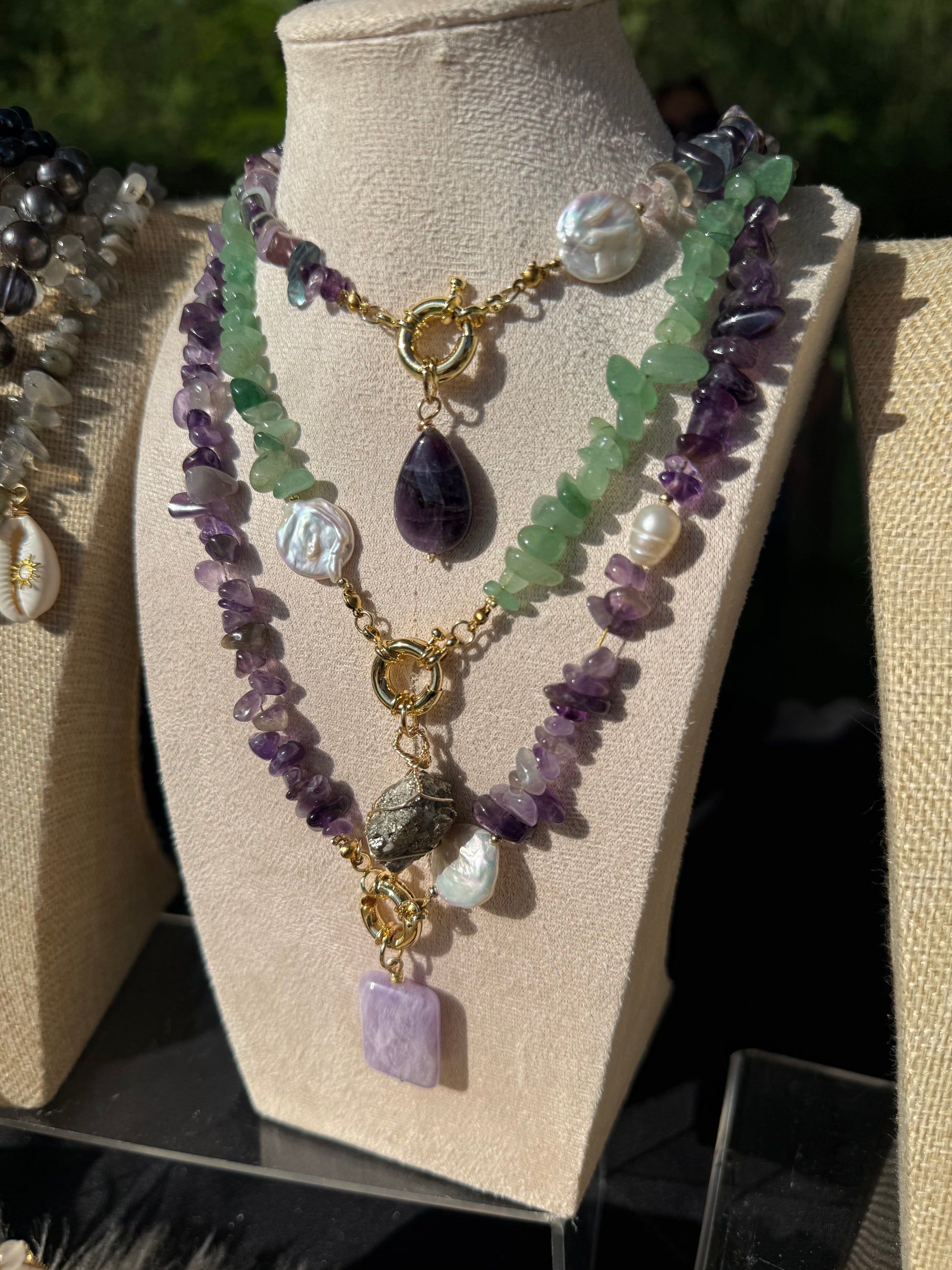 Collar con piedras chip en 3 tonalidades con piedras especiales y únicas, además de conector broche marinero, una perla de río y perla barroca.