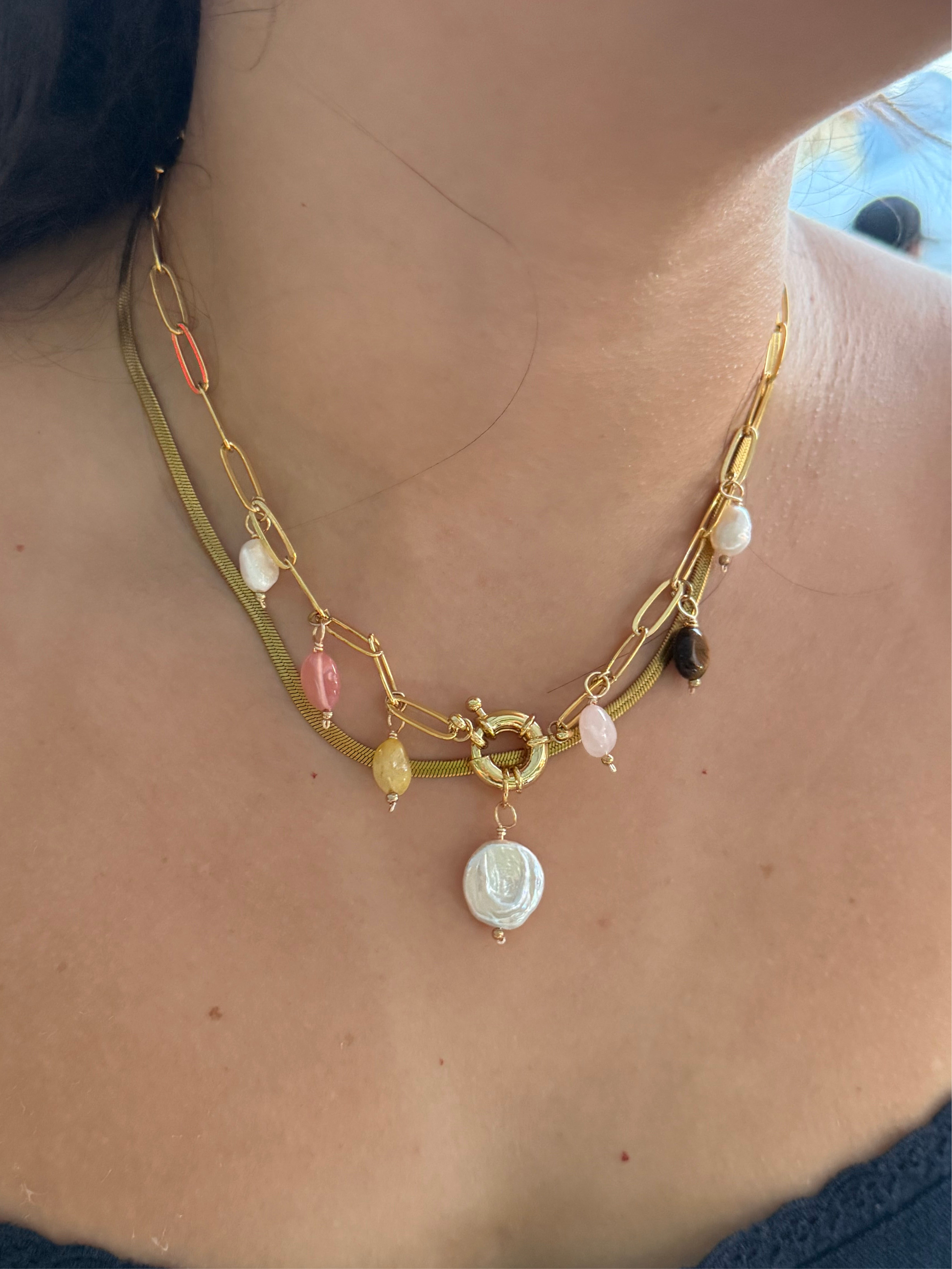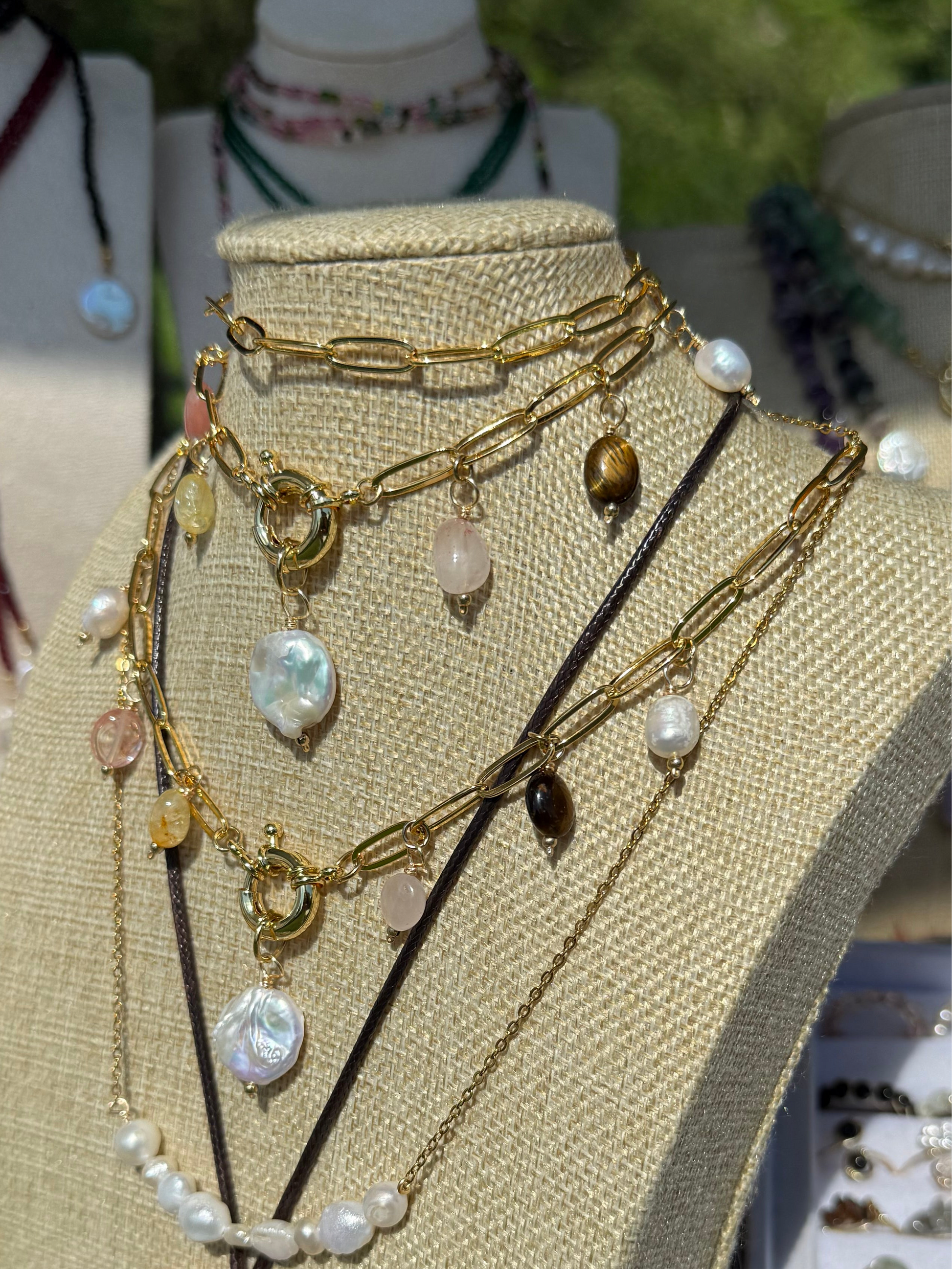 Collar de cadena en chapa de oro, broche marinero chapa de oro, con cuarzos como rosa, ojo de tigre, citrino y cuarzo cherry. Con toques de perlas de río y una perla barroca en medio. Mide entre 42-45 cm de largo.