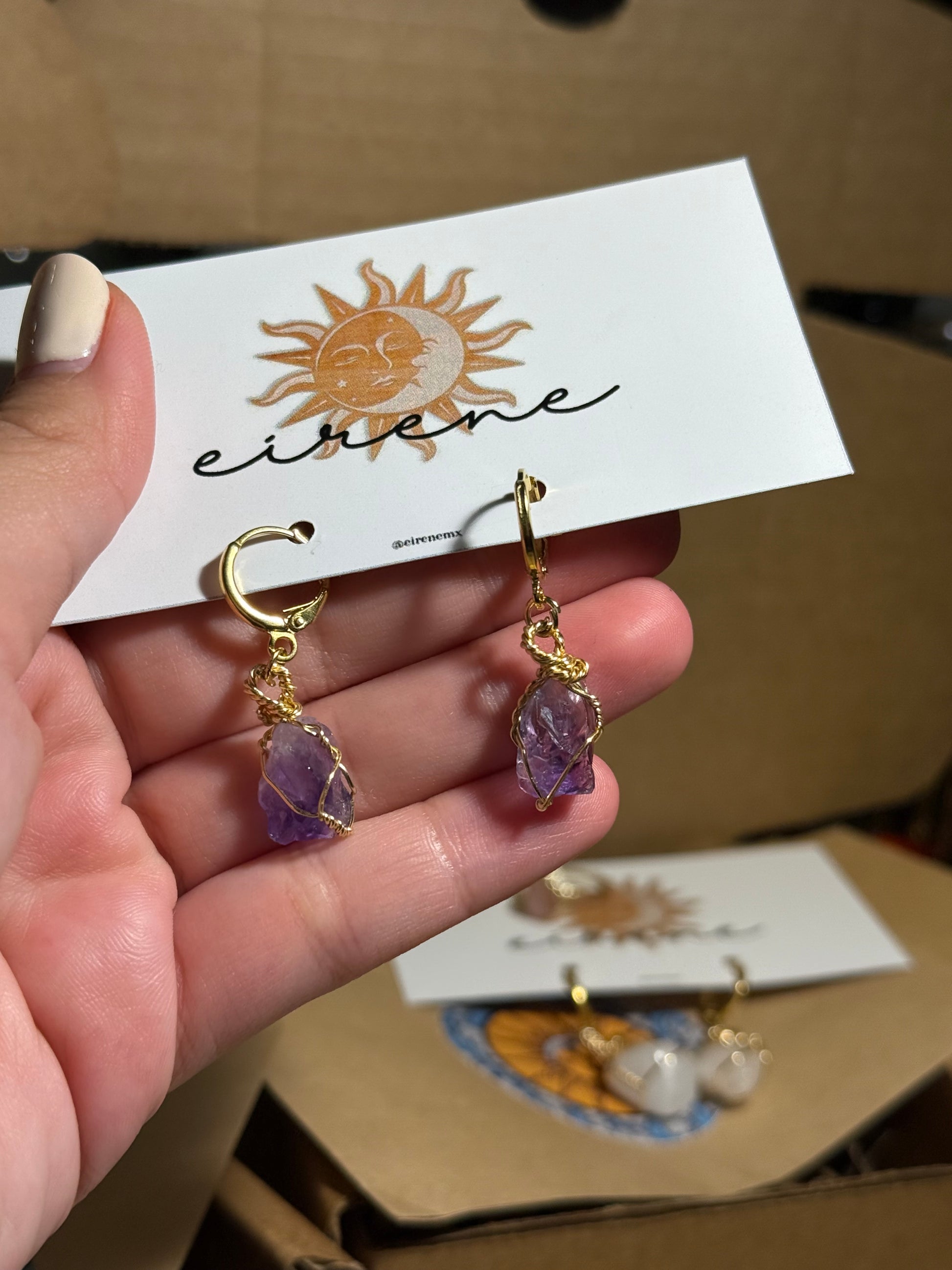 Huggies amatista en bruto con material de oro laminado, varía tonalidades y tamaños.