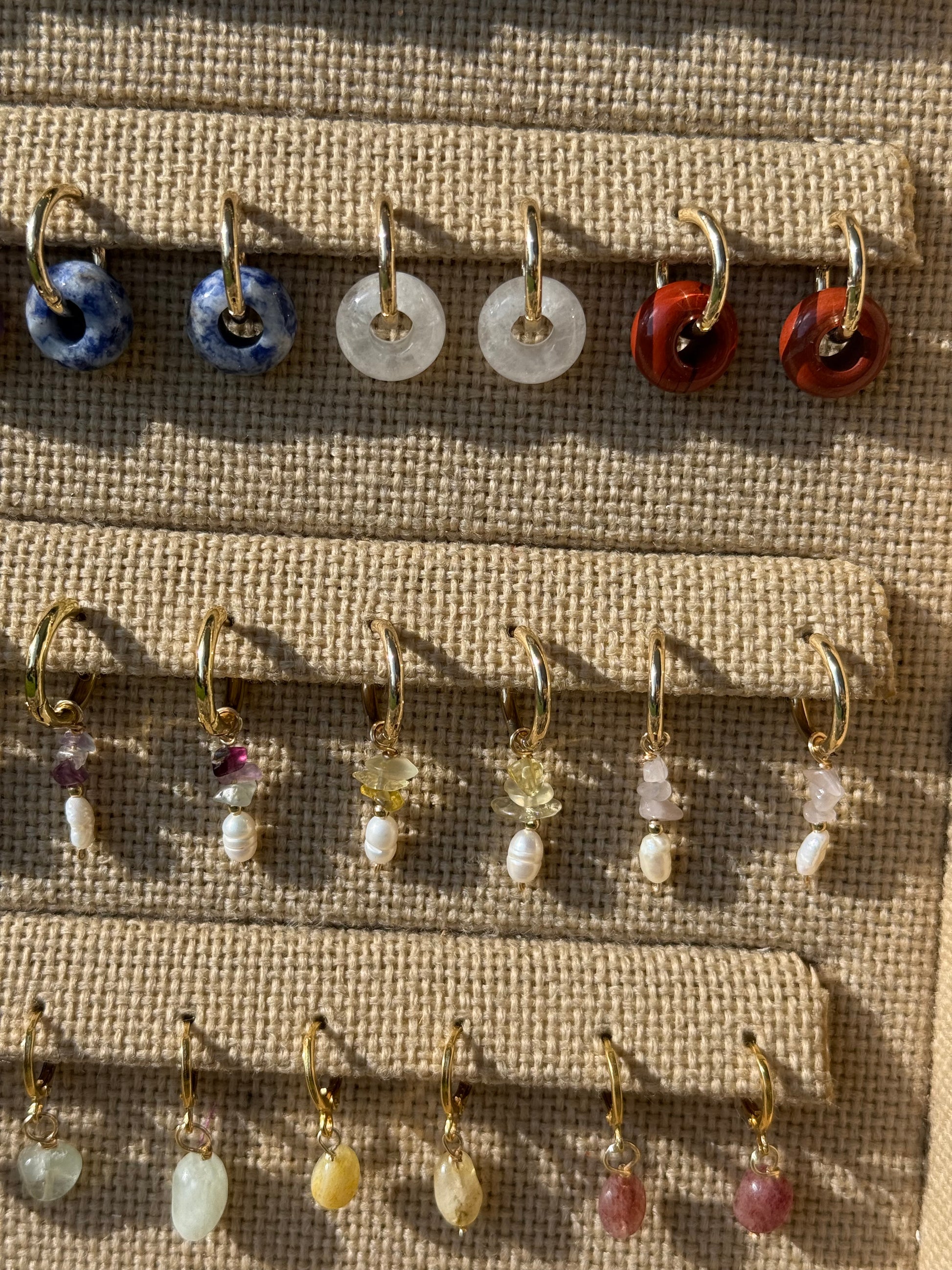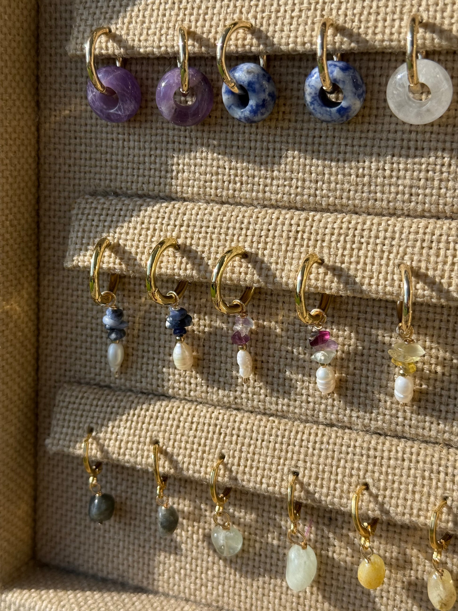 huggies de oro laminado con cuarzo chip y perla de río! con toques de chapa de oro.